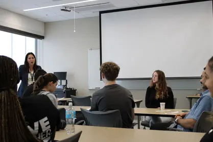 French professor Julie Pomerleau leads a 'Café francophone' event by guiding attendees through a French conversation in Trevor Colbourn Hall on Wednesday.